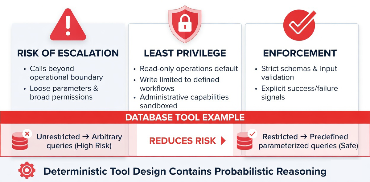 Consider a database access tool. If it allows arbitrary query generation without constraint, the reasoning engine may produce unintended queries. Restricting the tool to predefined parameterized queries reduces risk significantly.