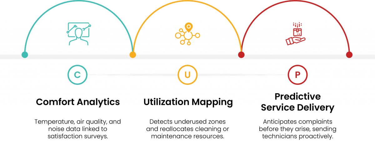 Facility management has a human side: comfort, safety, and experience. AI measures these indirectly through environment and behavior metrics.
